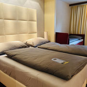 „Papa, hat das Hotel einen Pool“, haben mich die Kinder gefragt. Das ist bei uns inzwischen ein wichtiges Kriterium bei der Wahl der Unterkunft. Komfort ist ihnen weitgehend egal, so lange es was zum Plantschen gibt. Das Revierhotel Säntispark in St. Gallen hat da ein echtes Ass im Ärmel: eine riesige Bäder- und Rutschenwelt. Der Besuch des Wasserparks im gegenüberliegenden Freizeitzentrum mit zwölf großen Rutschen aller Schwierigkeitsgrade ist im Preis inkludiert. Pro Nacht gibt‘s einen kostenlosen Tageseintritt für die ganze Familie.